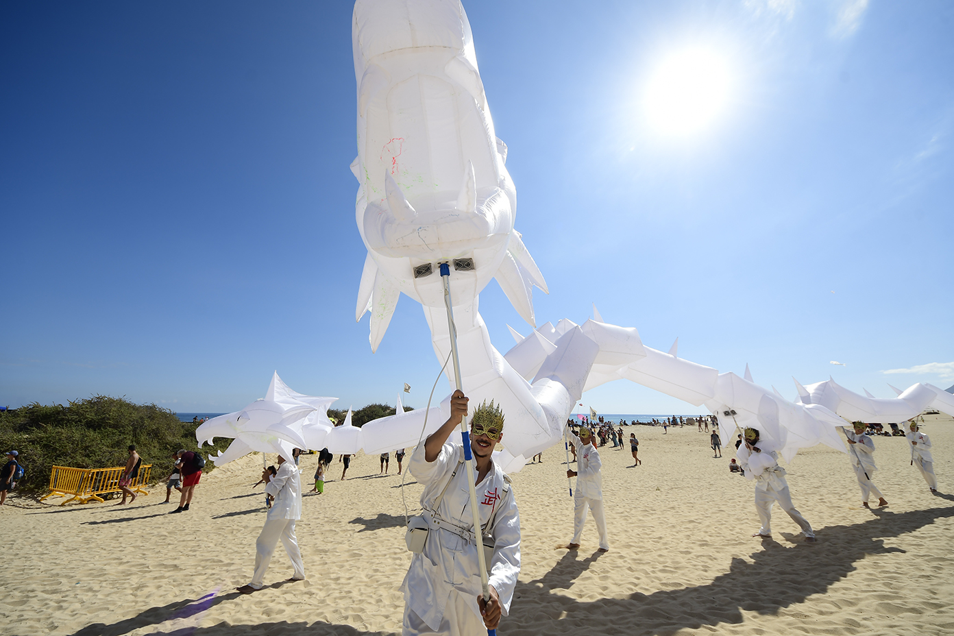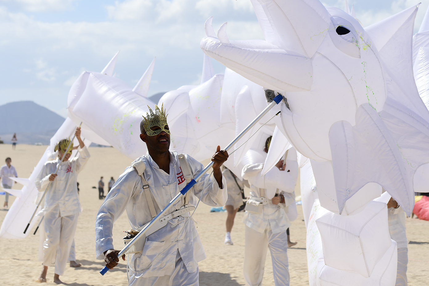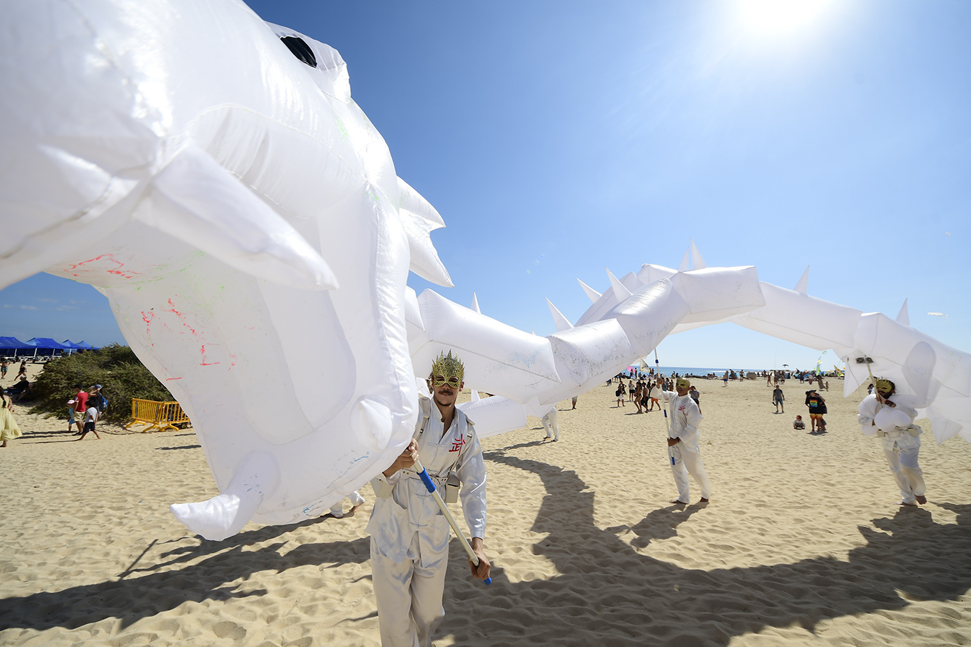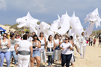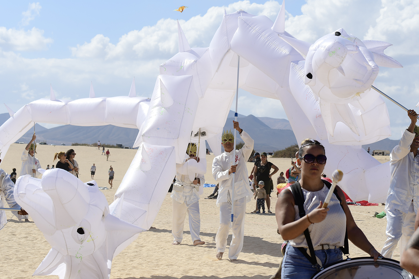 Mientras, el ritmo y la fanfarria pegadiza y contagiosa de la batucada ‘Timbaye’, acompañada de un Dragón Gigante de 3 Cabezas volvió a inundar este domingo la arena de las Grandes Playas de Corralejo para, posteriormente, dar paso, alrededor de las 14 horas, a ‘Artistas del Gremio’, la mejor charanga de España, que ponía nuevamente los cuerpos a bailar sobre la arena de El Dormidero con sus espontáneas sintonías.