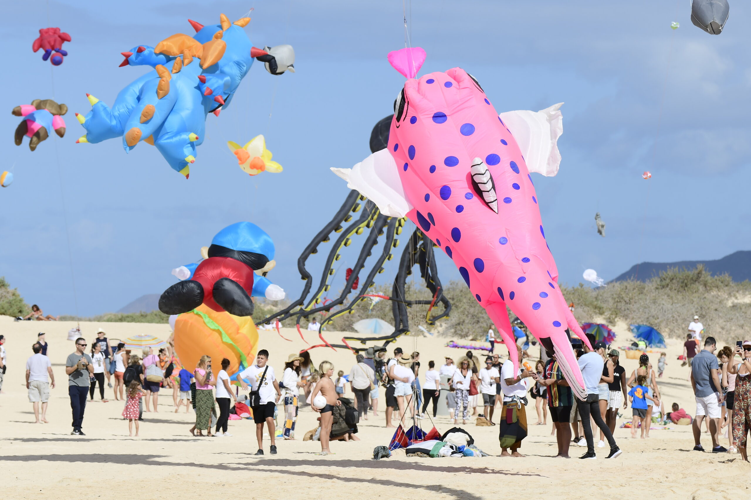 Rachas de hasta 20 kilómetros por hora de viento hicieron hoy disfrutar de una segunda jornada del 34º Festival Internacional de Cometas marcada por una afluencia histórica de público en las soleadas playas de las Dunas de Corralejo.
